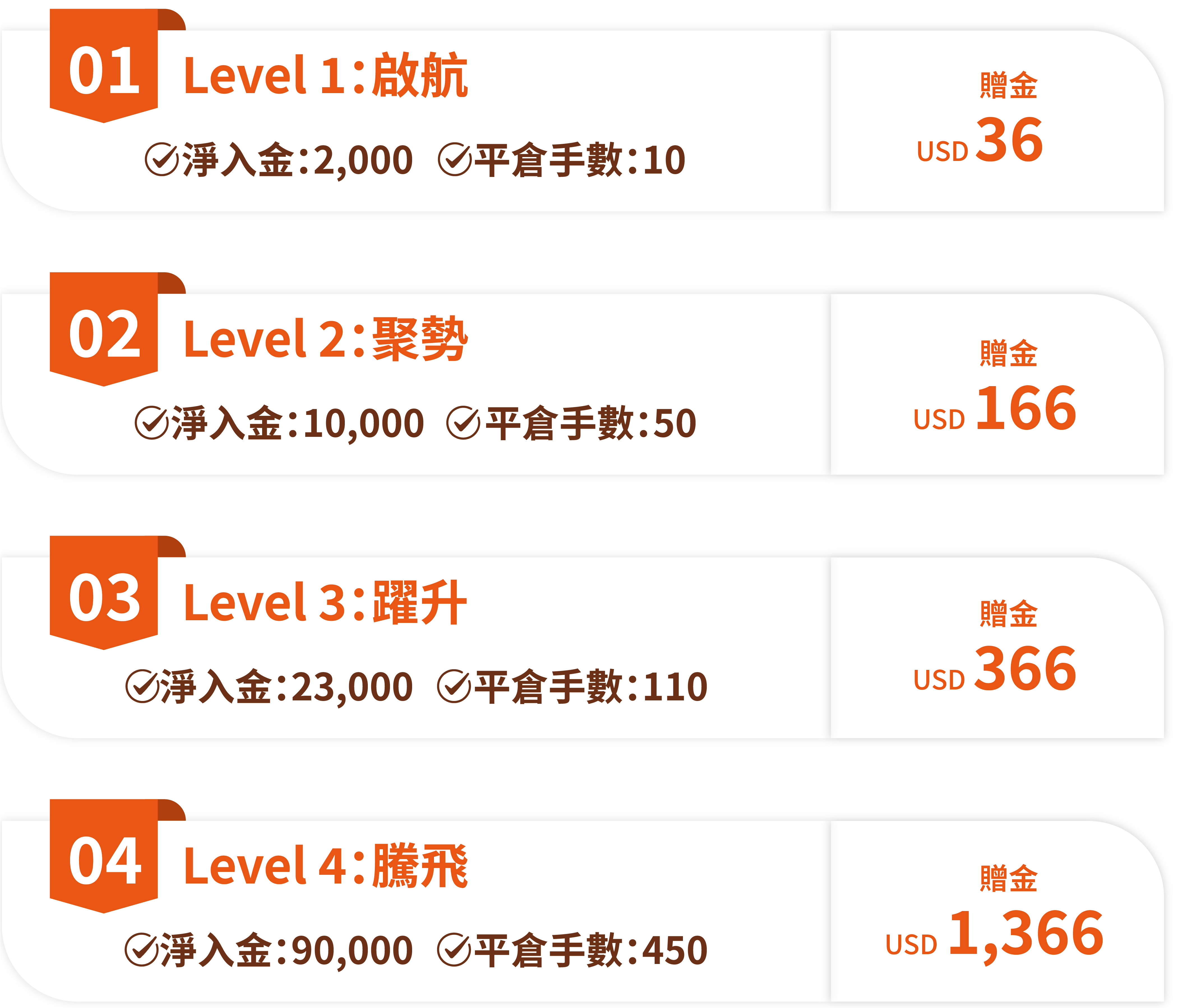 從啓航到傳奇,八大層級逐級解鎖!活動期間內,達成指定淨入金與平倉手數,即可解鎖對應層級贈金獎勵,最高可享 $36,666贈金回饋。