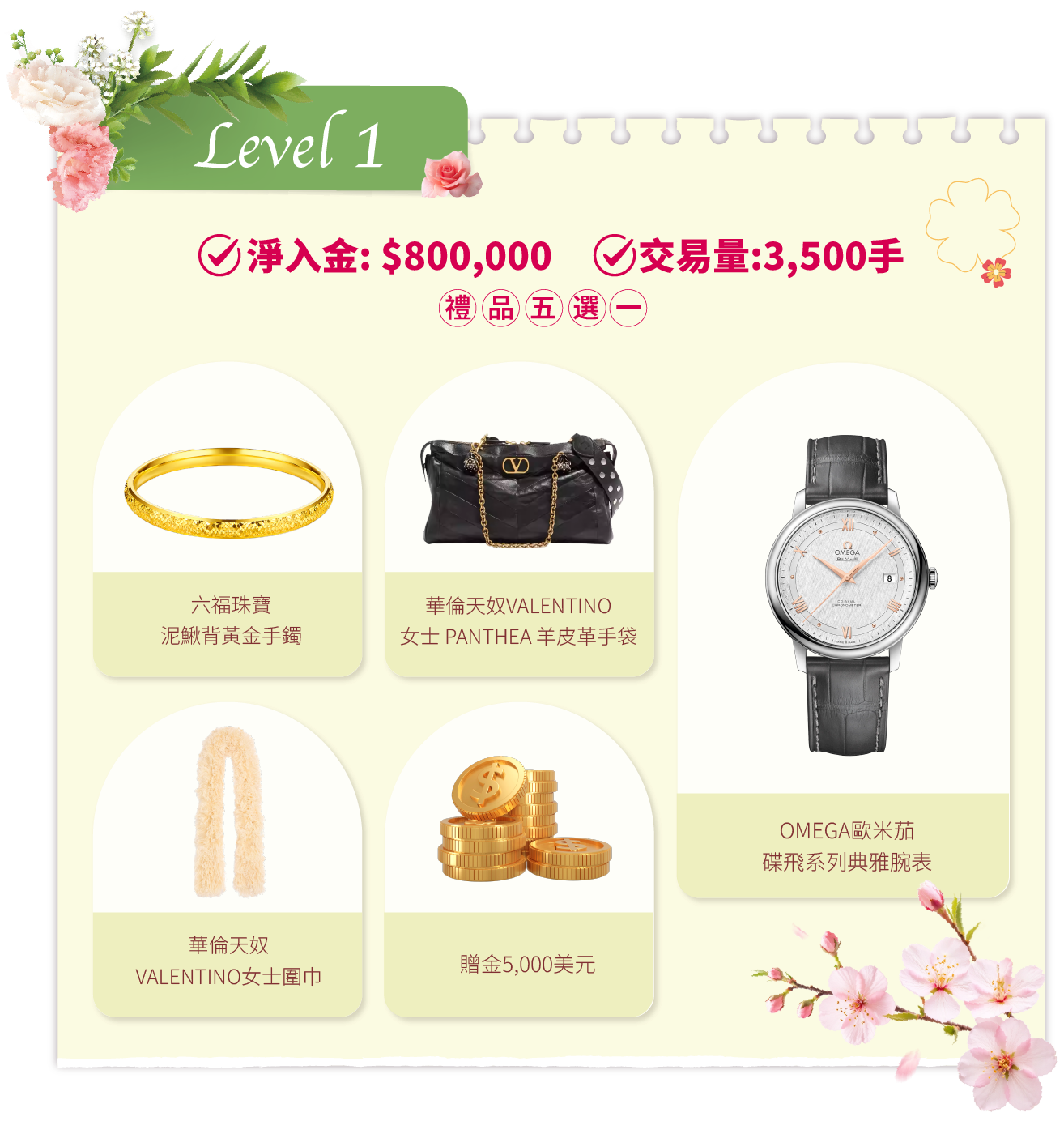 在活動期間內,客戶的淨入金和平倉手數(美股產品不計算在內)達到相應要求,即可在該層級的五件精選禮品中任選其一。若通過亨達APP完成交易,平倉手數將享有 三倍累计计算,助您更快达成目标!