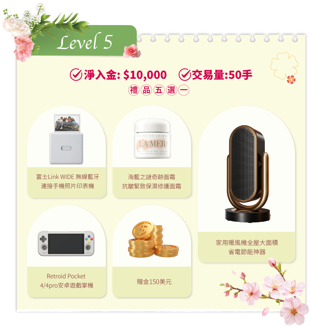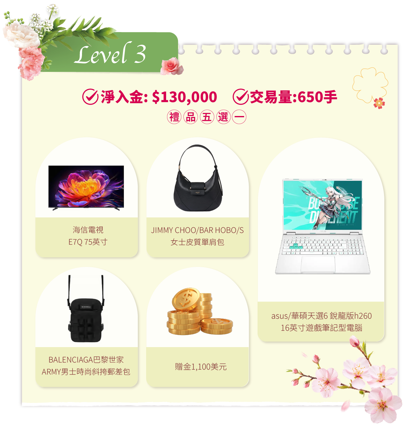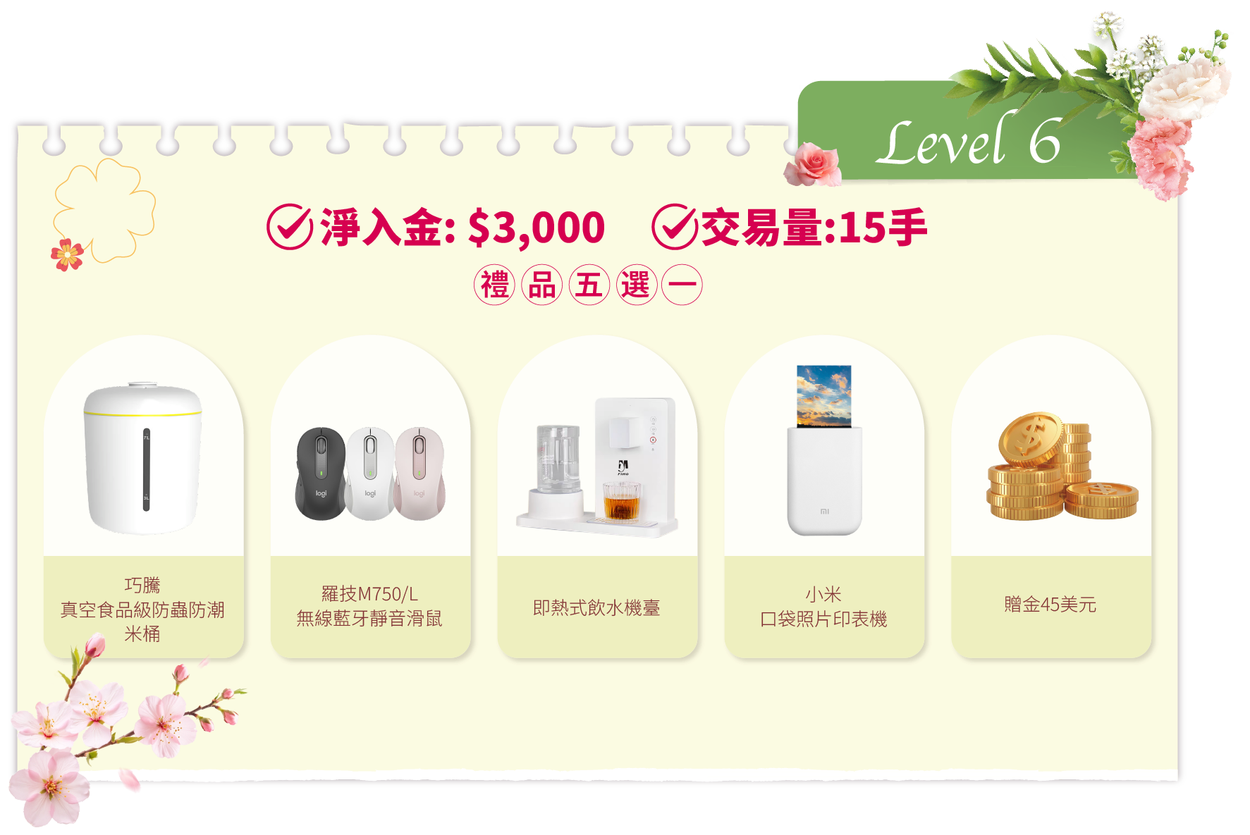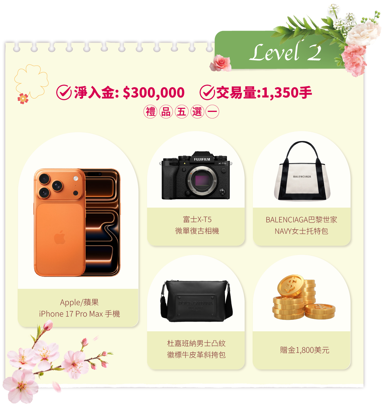 - 活動結束後的獎品發放流程:統計結果後,我們將安排專人聯繫各達標客戶。聯繫時會提供一個表單鏈接給獲獎者填寫。該表單用於收集獎品選擇及收貨資料。達標客戶需在2026年4月20日前提交表單。